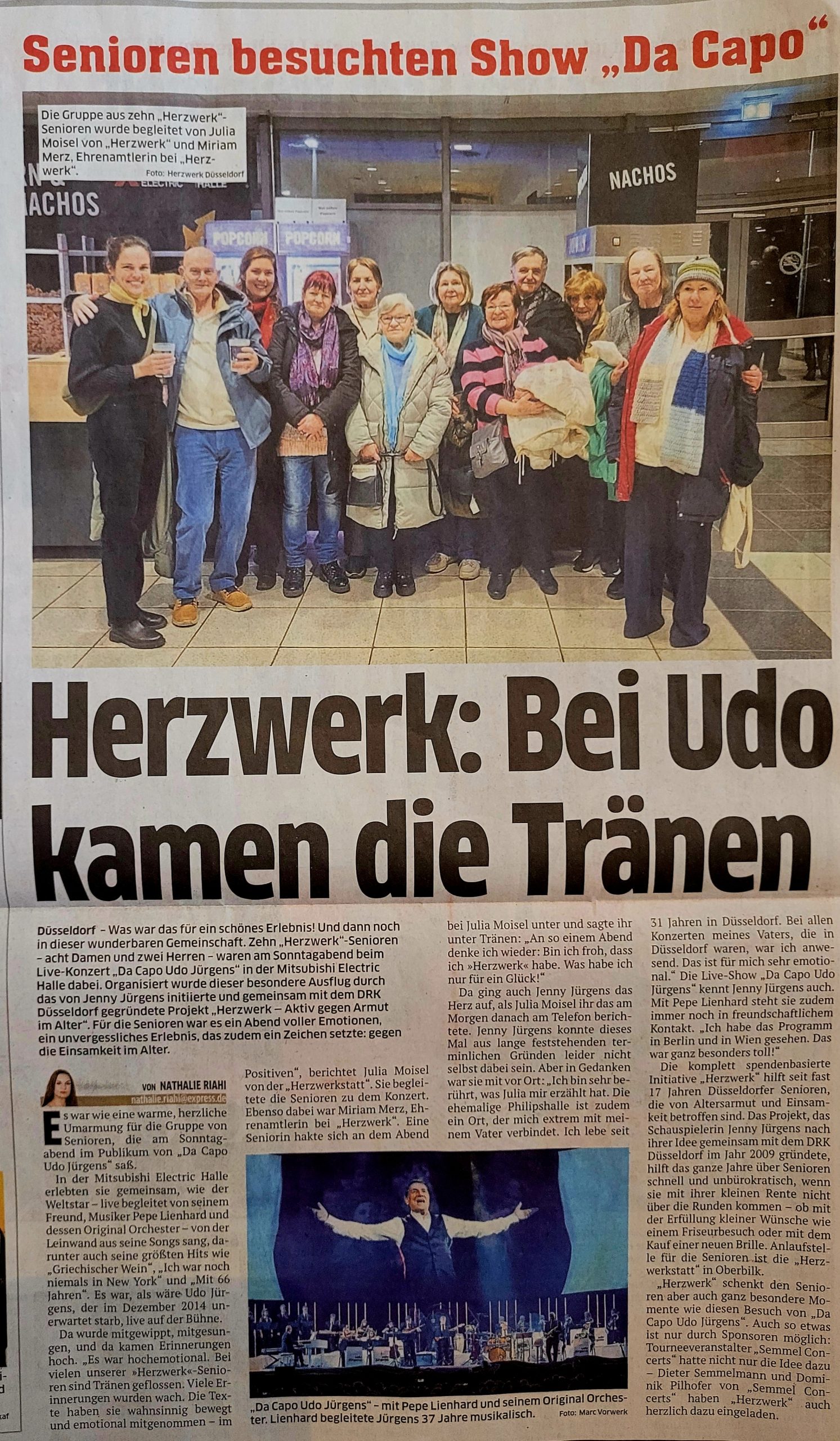Der Besuch der Show „Da Capo Udo Jürgens“ am vergangenen Sonntag wurde für 10 Herzwerk Senior: innen zu einem Abend voller Gefühle. Die Musik weckte Erinnerungen an frühere Zeiten, an Liebe, Verlust und besondere Lebensmomente. Viele sangen leise mit, andere konnten ihre Tränen nicht zurückhalten. Zwischen den Liedern wurde gelächelt, sich umarmt und gemeinsam geschwiegen. Es war ein Abend, der berührte, verband und noch lange nachwirkte. Für alle wurde spürbar: Musik kann Herzen öffnen und Einsamkeit für einen Moment vergessen lassen.