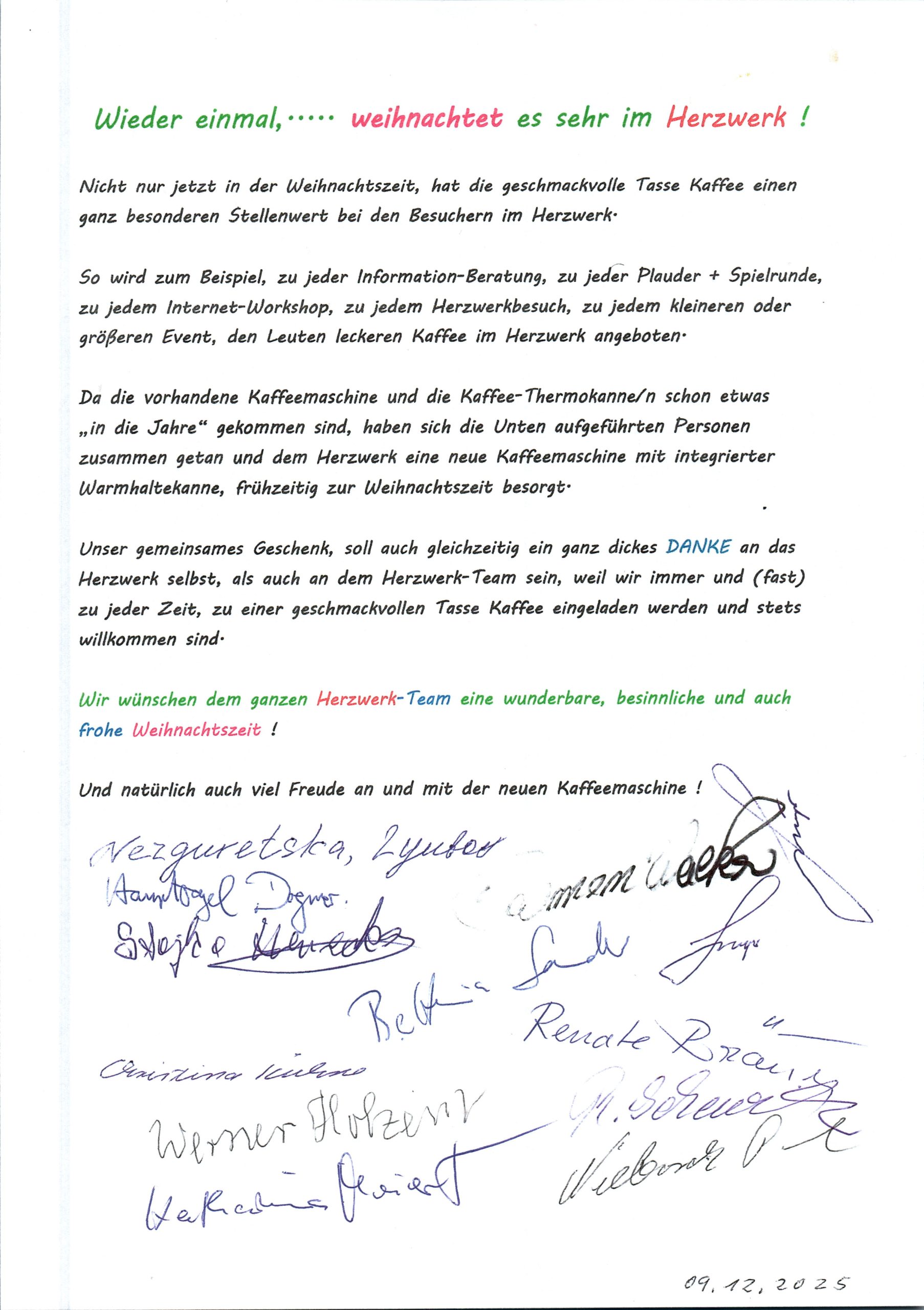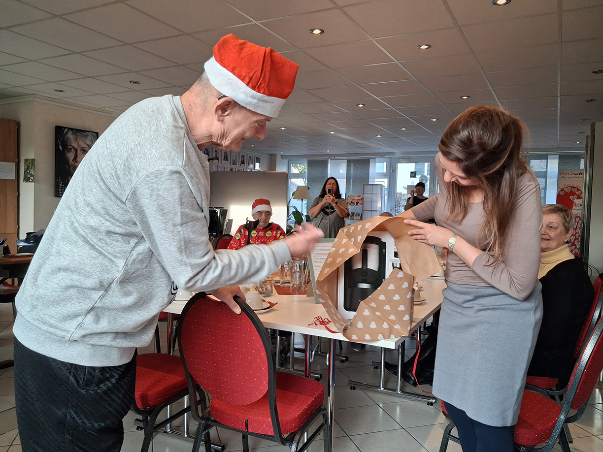 Anfang Dezember war es dann so weit, und der als „Kaffeetrinken mit dem Christkind“ im Kalender der Herzwerkstatt geblockte Termin fand statt: Oberchristkind Paul N., der das Ganze initiiert hatte, überreichte dem Herzwerk Team in Anwesenheit von rund 15 beteiligten Seniorinnen und Senioren eine funkelnagelneue Kaffeemaschine inklusive zweier Warmhaltekannen sowie Kaffeepulver und Filtertüten.